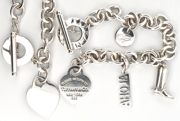 Description: Two classy Tiffany & Co. pieces complete this lot. The first is a 7.5” sterling silver toggle charm bracelet with three charms (an Aloha, a boot and an engraved “A” circle). The second is a 16” sterling silver toggle heart tag necklace. 4.00 troy ounces.