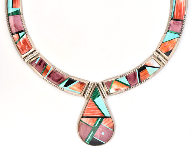 Description: Circa 1970/1980 this Frank Yellowstone Navajo sterling silver inlay necklace features cabs of turquoise, malachite, onyx, sugilite and other various agate cuts. This necklace is in excellent condition with vintage patina. Length 24”, 3.53 troy ounces.