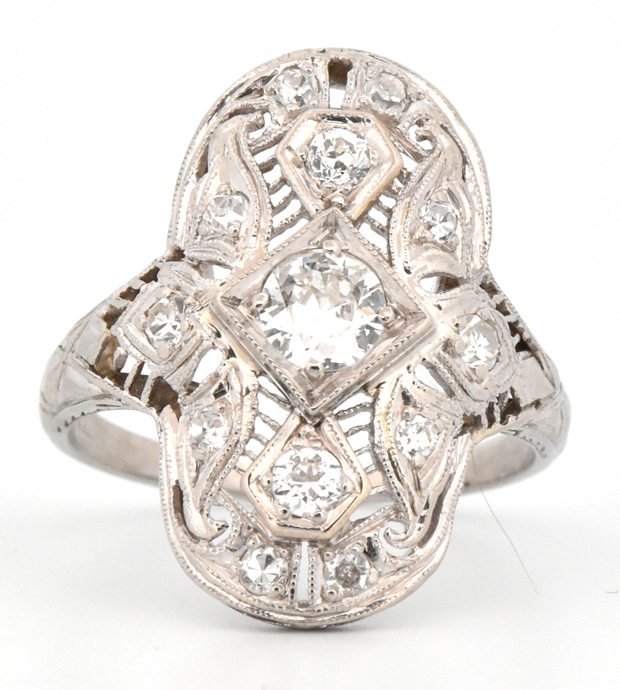Description: Marked 18K and Platinum, this vintage North to South ring mixes diamonds, milgrain and open filigree work for the perfect vintage keepsake. The old cut round diamonds weigh an estimated .50 cttw, SI clarity, I color. Ring size 5, 2.2 dwt.