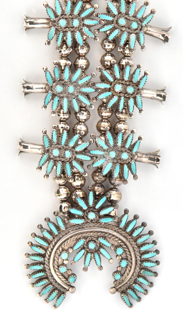 Description: Circa 1950/1960 and signed by Ed. Niiha, this Zuni sterling silver (tested) and petit point turquoise squash blossom necklace features turquoise cabs that look like they might be from the Lone Mountain Mine. The necklace is in excellent condition with vintage patina. Length 25”, 2.37 troy ounces.