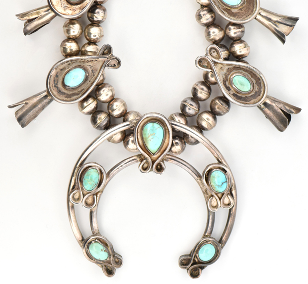 Description: Circa 1950/1960 this unknown maker Old Pawn sterling silver (tested) turquoise squash blossom necklace features turquoise cabs that look like they might be from the Fox Mine of Nevada. The necklace has a five stone Naja pendant and 10 blossoms. The reverse of the Naja is inscribed with what we believe to be a pawnbroker’s numbers, which is rare to find. The necklace is in excellent condition with vintage patina. Length 26”, 6.64 troy ounces.