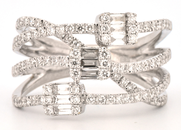 Description: Made by Effy, this super fun wavy twisted four row diamond band contains an estimated .75 cttw in round brilliant and baguette diamonds, SI clarity, G-H color. Ring size 7, 3.7 dwt.