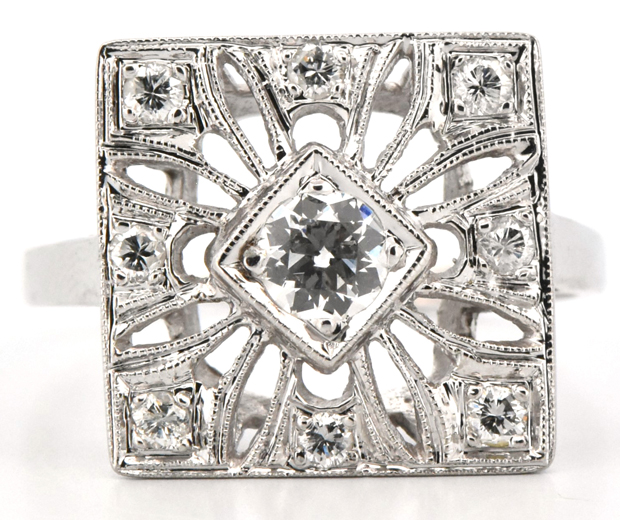 Description: A lovely vintage diamond panel ring with nine old cut round diamonds weighing an estimated .60 cttw, SI clarity, I color. Ring size 8, 2.7 dwt.