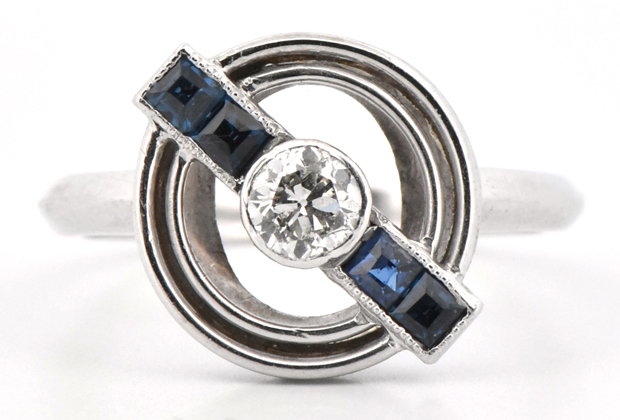 Description: A dainty vintage ring with four square synthetic sapphires and an approximate .20 ct. old European cut diamond that is bezel set in the middle of two circular rows with the stones sitting diagonally across them. Ring size 3.75, 2.0 dwt.