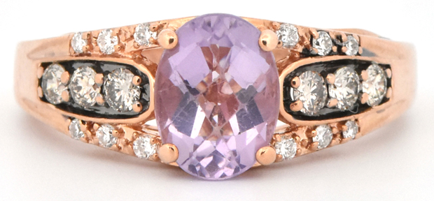Description: This lovely LeVian ring features an 8x6mm oval light purple amethyst with champagne and white round brilliant diamond accents weighing an estimated .50 cttw, SI clarity. Ring size 5, 2.6 dwt.