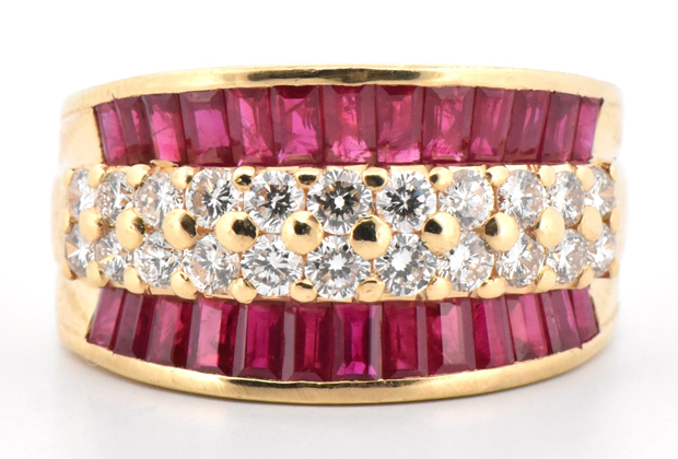 Description: From the 18K collection, this fashionable LeVian ring boasts a double row of round brilliant diamonds weighing approximately 1.00 cttw, SI1 clarity, G-H color with out rows of deep-red ruby baguettes. Ring size 10, 8.6 dwt.