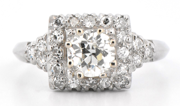 Description: A sparkling vintage diamond ring with an approximate .65 ct. old European cut, SI clarity, M color with single cut round side diamonds weighing an estimated .20 cttw, SI clarity, I-J color. Ring size 6, 2.1 dwt.