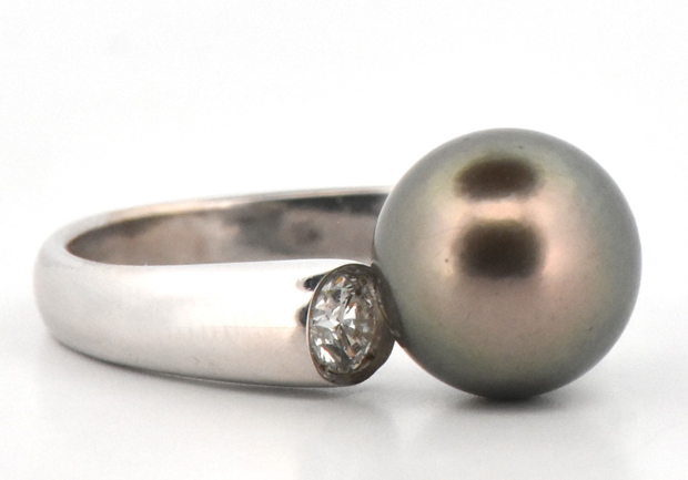Description: A modern cocktail ring with a 9.38mm dark gray cultured saltwater pearl, no indications of treatments, GIA Report # 2235690588, with a bezel set round brilliant diamond accent weighing approximately .25 ct., SI clarity, H color. Ring size 6, 3.6 dwt.