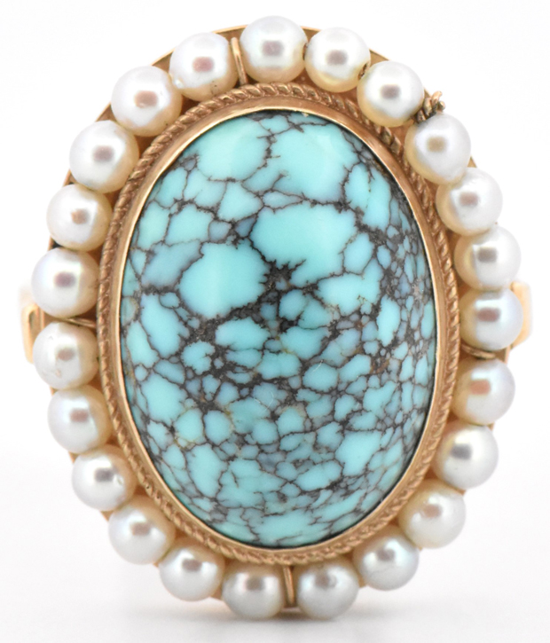 Description: Vintage 14K yellow gold cocktail ring that features a 17 x 13mm cab of black matrix turquoise which appears to originate from the Blue Diamond Mine of Nevada. Surrounding the center stone is a border of 2.5mm cultured pearls. Ring size 8.25, 6.4 dwt.
