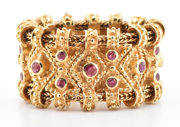Description: This high karat ring (holds up to the 22K acid test) has a flexible make that includes twisted cable links with small bezel set ruby accents. The ring measures 16mm all the way around. Ring size 7, 11.6 dwt.