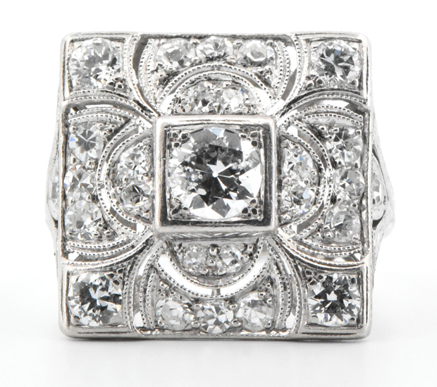 Description: A gorgeous square panel Art Deco ring with old European cut round and single cut diamonds weighing an estimated 1.00 cttw, SI clarity, I color with milgrain and open space that creates a beautiful design. Ring size 5.25, 3.0 dwt.