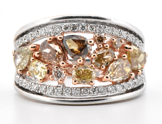 Description: This band measures 14.5mm and contains a fanciful array of yellow, brown and champagne round, oval, cushion and pear shape diamonds with a single row of round brilliant white diamonds on either side. All the diamonds weigh an estimated 1.50 cttw, SI clarity. Ring size 7.5, 5.9 dwt.