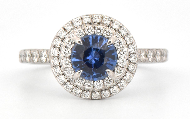 Description: From the Tiffany and Co. website, “Named after “sol,” the Spanish word for sun, the Tiffany Soleste® collection’s luminous aesthetic captures the warmth and energy of the sun in a radiant celebration of Tiffany & Co.’s legendary gemstones. Each design features a captivating center stone enveloped by a halo of round brilliant diamonds, creating a mesmerizing sparkle.” This particular ring has a 5mm round tanzanite with a double halo with round brilliant diamonds weighing an estimated .50 cttw, VS clarity, G color. Ring size 4, 2.5 dwt.