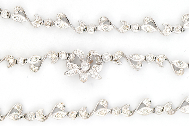 Description: A fancy diamond necklace with swirly ribbon-like designs containing approximately 2.50 cttw of round brilliant cut diamonds, SI2-I1 clarity, I-J color set with a milgrain detailing. Length 18”, 13.7 dwt.