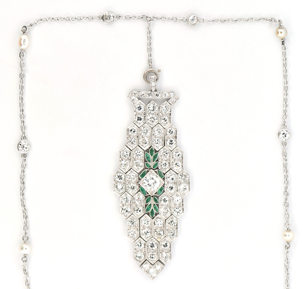 Description: This 14K vintage station chain includes six pearls and six bezel set old cut round diamonds weighing approximately .80 cttw, SI2-I1 clarity, I-J color with a .75” lariat style drop that has a spring ring holding a super-cool platinum diamond and emerald pendant with flexible links made up of old European cut round diamonds weighing over 4.00 cttw, SI clarity, J-K color with small emerald accents that do have some chipping on them. Length 18”, Dimensions: 2.5” x 1”, 15.4 dwt.