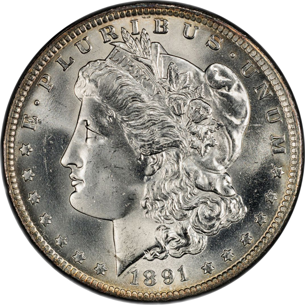 Description: Astonishing, glistening silver-bright luster dominates the eye-appeal, which is considerably better than average for 1891-O, which often comes a little softly struck. Not so this borderline razor-sharp example, whose only offense appears to be very few tiny nicks on the cheek.