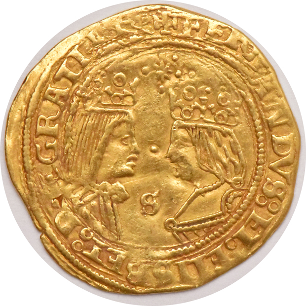 Description: (1476-1516) Seville mint, Ferdinand and Isabella, eight pointed star above portraits. Actually dubbed a "double-excelente", precursor to the 2-escudos denomination, this example features intricate detailing on a convincingly round flan. "Cleaning" seems irrelevant for a highly collectable coin such as this.