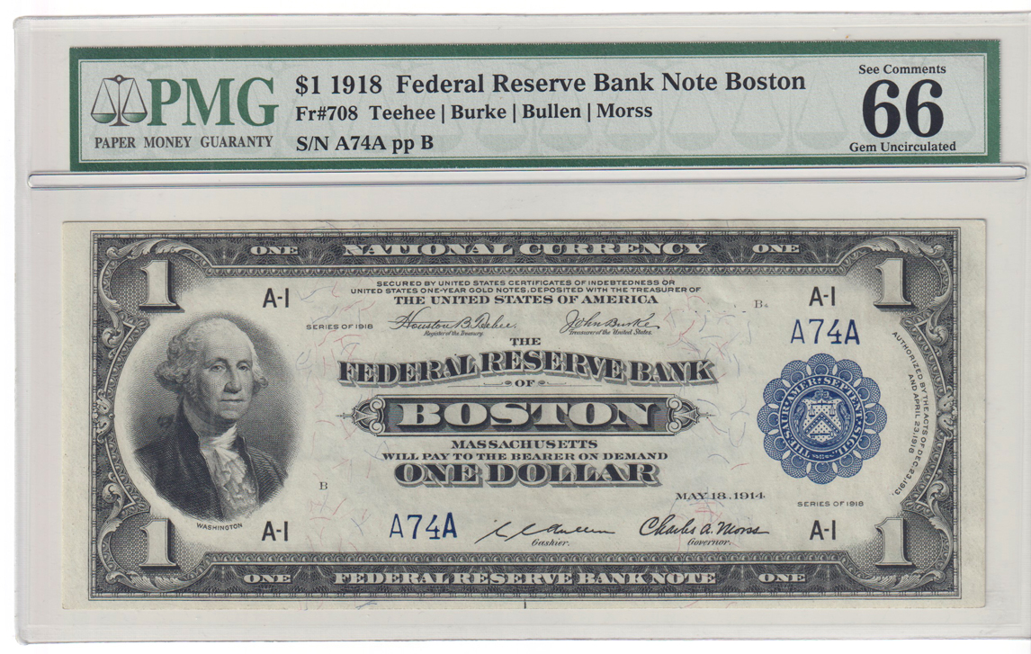 Lot Title: 1918 $1 Boston Fr# 708 - PMG GemCU-66 EPQ