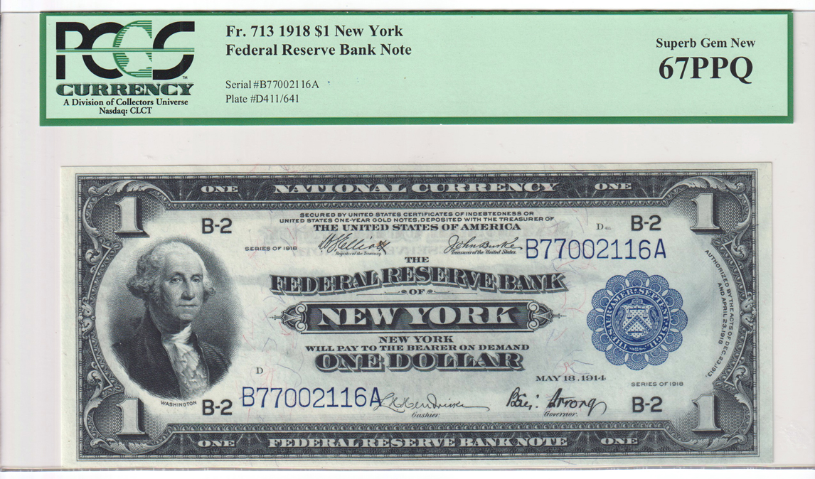 Lot Title: 1918 $1 New York Fr# 713 - PCGS GemCU-67 PPQ