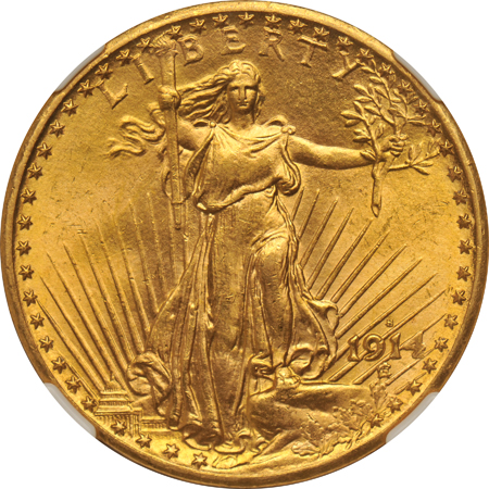 Description: 1910-D represents one of the most prevalent dates in the Saint-Gaudens series at the proffered grade level, although it is not seen nearly as often as the truly common later Philadelphia issues. If anything, 1914-S is an even more common issue, but this is a very pretty example at MS-63, showing particularly attractive royal-gold patina and sharp detail except at the "4" in the date. Two coin lot.