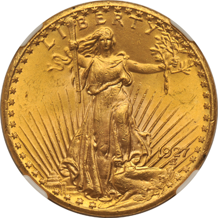 Description: Fields display minimal abrasions, but just enough ticks scatter up and down Liberty's torso to bar a full gem grade. The surface exudes delightful vintage gold coloration, energized by exceptionally strong luster.