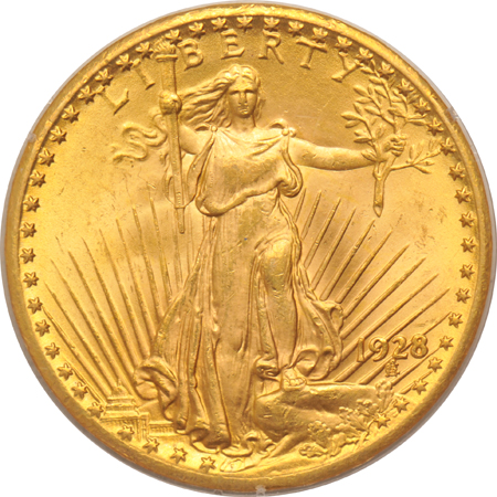 Description: Delightful, satiny mint frost endows this relatively abundant double-eagle issue with uncommon eye-appeal. 1928 represents the final entry for the very common issues in the Saint-Gaudens series.