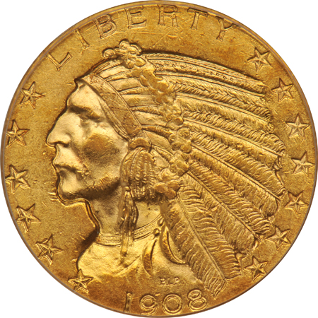 1904 Liberty half-eagle, and a 1908 Indian half-eagle, both PCGS MS-60 (green label)