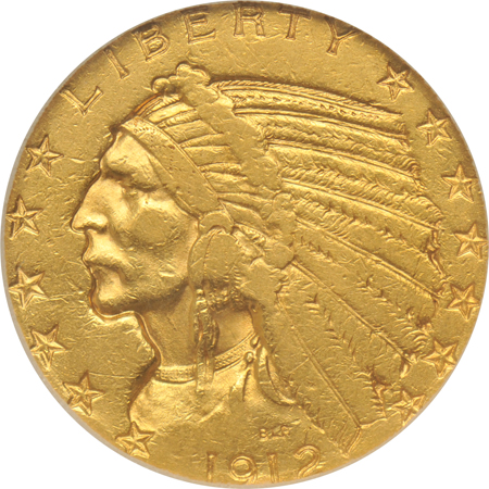 Description: ICG offers a grade of AU-58 for the 1894-O half-eagle, but surfaces are quite glossy, in part due to slight semi-prooflike fields beneath circulation abrasions. The 1912-S half-eagle gets a grade of AU-50 by NNC, but this seems to be a very optimistic sentiment compared to the cataloger's opinion of XF/cleaned. Two coin lot.
