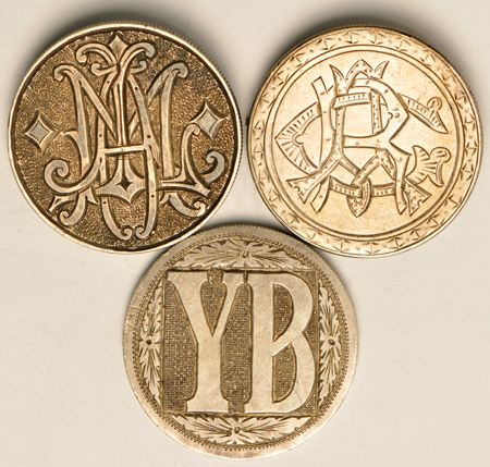 Description: Tom Stevens Collection. Collectors who focus on love tokens will find plenty to like about this lot, which includes three inscribed dollars, and one necklace. The necklace actually has engraved dimes serving as chain links, each inscribed with meaningful (to somebody) mementos, including dates. An inscribed 1877 quarter serves as the main charm. Silver dollars include one prominently featuring "YB" on a fancy background, another displaying "CRA" (probably) within a decorated border, and a third showing "M?A" layered over a textured field. Personal inspection MANDATORY for this absolutely fantastic grouping!