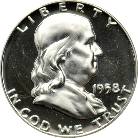 Description: Fresh out of the plastic factory is this quartet of brilliant, bright white Franklin half-dollars, all cameo or better. Not a speck of toning is to be found anywhere, which makes a simple listing of grades an adequate representation as follows: 1953 (PF-66 CAM), 1954 (PF-66 CAM), 1958 (PF-67 CAM), and 1960 (PF-67 DCAM, and certainly the jewel of this grouping). Four coin lot.