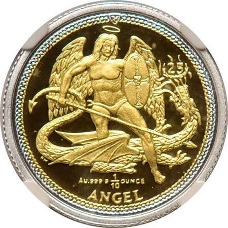 Description: Mick Matters Collection. The 1915-B 20-franc coin shimmers with semi-prooflike eye-appeal and unfailingly pristine fields. A single contact mark just under the chin determines the grade. A 2009 1/10-ounce gold Isle of Man accompanies and has achieved near-perfection at the PF-69 UCAM level. This is an extraordinary presentation given the diminutive size, with eye-appeal augmented by the lovely framing of the bi-metallic format. Two coin lot.