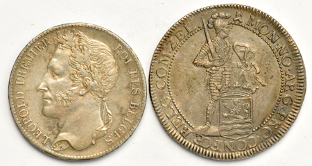 Description: Pevely Farms Consignment. A quintet of crown-sized pieces comprise this grouping. They may be indicated as follows: Belgium - Leopold I 1835 5-francs KM#3.1 (VF, stained reverse), Congo - Leopold II 1887 5-francs KM#8.1 (near UNC, corrosion spots and severely cleaned), Germany - Besancon 1658 (32-groschen) KM#48 (XF, scratched and cleaned), Netherlands - Groningen - Ommeland 1682 ducaton KM#40 (near UNC, terrific quality and very scarce), and Netherlands - Zeeland 1757 silver ducat KM# 52.3, Dav-1848A (XF, pleasing quality). Five coin lot.
