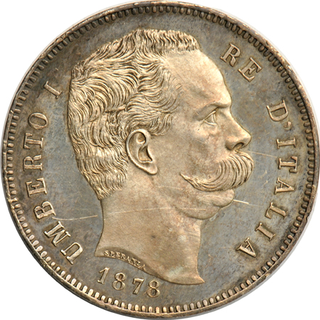 Description: Pevely Farms Consignment. The Italy Kingdom 1878 5-lire (select proof, KM#20) shows impeccable cameo contrast and would grade higher if not for a pair of intermittent pin scratches across the obverse. The 1913A Germany-Prussia 5-mark (select proof, KM#536) features modest mirrors, and also suffers a few minor hairlines, as well as a greyish spot flung into the obverse upper right field. Two coin lot.
