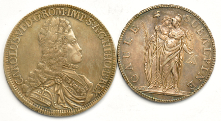 Description: Pevely Farms Consignment. Half a dozen crown-sized pieces comprise this grouping. They may be indicated as follows: Austria - Ferdinand III 1646 KM# 920, Dav-3189 (XF and bent as struck), Austria - Karl VI 1716 KM#1570, Dav-1051 (VF, but bent), France - Napoleon 1813A 5-francs AU58 NGC, KM#694.1 (near mint but corrosion patches on the reverse), Isle de France - Bonaparte 1810 10-livres KM#1 (VF, cleaned with poorly struck central detail as always), Italy - Cisalpine Republic 1799 (Year 8) scudo KM#2 (UNC, prooflike but scratched and corroded on the reverse), and Italy - Piedmont-Subalpine Republic undated (1800) 5-francs l'an KM#C4, Dav-197 (XF, light staining on the reverse). Six coin lot.