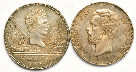 Description: Pevely Farms Consignment. First is a Peru 1838 Proclamation Medal struck by the Cuzco mint to honor Marshal Andres de Santa Cruz (high XF, stains on the reverse) and it is the size of an 8-reales. The balance of the group may be indicated as follows: Argentina - Cordoba 1852 8 Reales KM#32 (UNC but moderately corroded), Italy - Milan Philip II 1588 escudo MB#181 (high VF or even XF and definitely nicer than average for the type), Spain - Philip V 1718 SM 8-reales KM#310 (XF), Spain - Charles IV 1805 8-reales KM#432.1 (near UNC), Spain - Amadeo I 1871 5-pesetas KM#666 (XF), Spain - Alfonso XIII 1889 5-pesetas KM#689 (high XF with trivial hairline scratches). Seven coin lot.