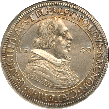 Description: Vida D. Bertie's Consignment. KM#264.2; obv: LEOPOLDVS: NECNON: CAETERI: D: G: ARCHID: AUSTRI; rev: DVC: BVRG: STYR: CAR: ET: CARN: COM: TYROL:. Hall mint. Vigorous shimmering luster supports details that scarcely appear to have any wear at all. Struck on a flan that seems to have been virtually defect-free, aside from slight crumbling at the obverse extreme right edge.