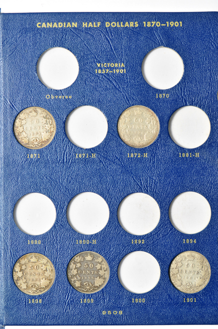Description: While this is a Whitman album entitled "Canadian Halves 1870-1936", the set is comprised, of course, of 50-cent pieces, although about half the required coins are missing. A rapid listing of present pieces includes: 1871, 1872-H, 1898, 1899, 1901, 1903-H, 1907, 1909, 1910, 1911, 1912, 1913, 1916, 1917, 1918, 1919, 1929, 1931, and 1936, with condition ranging from VG to Fine or so.