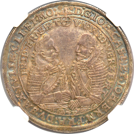 Description: Vida D. Bertie's Consignment. KM#17; obv: D: G: IOH: CASI: ET: IOH: ERN: FRA: DV: SAX: IVLIÆ: CLI: ET: MO; rev: LANDG: THV: MAR: MIS: COM: MAR: ET: RAVENS: DN: IN: RAV: WA. Battleship-grey toning adorns each side, relieved within portions of the peripheral design by some lovely iridescent indigo-jade color. The numismatic idea of positioning both portraits of co-rulers on a single side of a coin evolved around 1542 when the Ernestine and Albertine lines of the House of Wettin struck coinage jointly. CATALOGER'S NOTE: This coin serves as the "plate coin" for the KM type on NGC's World Coin Price Guide.