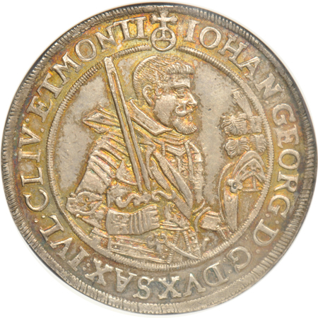 Description: Vida D. Bertie's Consignment: KM#132; obv: IOHAN: GEORG: D: G: DVX SAX: IVL: CLIV: ET: MONTI:; rev: SA: ROM: IMP: ARCHIM: ET ELECT. Exquisite eye-appeal for this German States thaler takes advantage of pleasing definition and what appears to be fully original mulberry-grey patina. Copper tones swirl next to many of the higher-relief design elements. CATALOGER'S NOTE: This coin serves as the "plate coin" for the KM type on NGC's World Coin Price Guide.