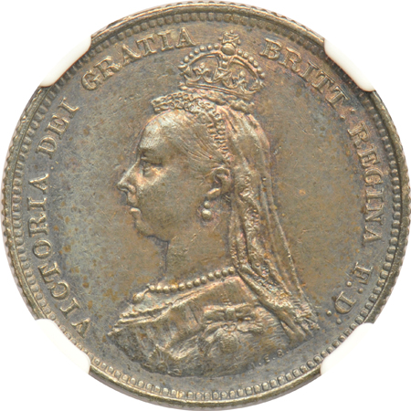 Description: British pieces all dated 1887 make up this grouping with a nice mixture of all-different denominations. They may be quickly listed as follows: crown (VF/reverse damage, which is really just a scratch off to the left), half-crown "jubilee head" (VF-30), 4-shilling "Arabic 1" (AU-58), 2-shilling "jubilee head" (XF-45), shilling "jubilee head" (AU/mount removed), sixpence "jubilee head and shield" (MS-63), three pence "jubilee head" (MS-61), penny (MS-62 BN), halfpenny (MS-62 BN), and farthing (AU-58 BN). Ten coin lot.