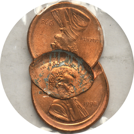 Description: It would be going a bit far to call any individual piece "rare", but some better errors are present within this substantial grouping of mostly mint errors (a couple of oddball tokens are also present). Of particular note are three remarkable "chain strike" coins, each a mated pair, represented by an undated clad dime and two Lincoln cents dated 1998-P and 2000-P. Further perusal reveals a plethora of flip over double strikes, brockage coins, broad strikes, strike-through errors, capped-die strikes, clipped planchets, and missing clad layers. PERSONAL INSPECTION MANDATORY.