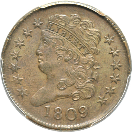 Description: An 1809 certified in a PCGS AU-53 holder possesses good eye-appeal due to some frosty mint-green iridescence within brown, lustrous fields. Lovely sharpness includes practically full details, especially through every curl of Liberty's hair. Remaining half-cents have never been certified, and list quickly as followed: 1795 (F/plugged), 1808 (Fine/reverse scratch), 1828 (AU-55), and 1856 (MS-60). Five coin lot.