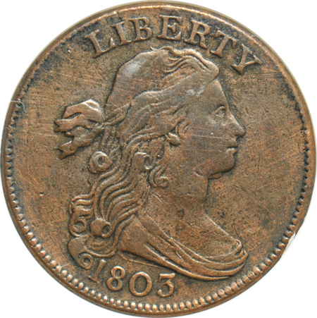 Description: An 1803 "small date, small fraction" (PCI red VF/environmental damage) is the lone "off brand" representative, but the PCI description is actually dead-on accurate, as the sharpness even exceeds the VF-20 level despite isolated portions of corrosion. Old small ANACS holders have certified a pair of coins as an 1804 half-cent (XF-45, walnut-brown patina over attractive flowline luster) and 1909 Indian cent (MS-64 RD), while the lone NGC coin is a 1912-D cent (MS-63 RB). Three and a half-cents face within this four coin lot!