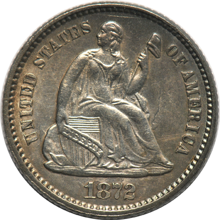1834 Bust half-dime AU, and an 1872 Seated Liberty half-dime AU