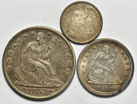 Description: Prominent details vouch for quite high grades for each member of this Seated Liberty trio. In descending face value order, these may be hastily enumerated as follows: 1853 half-dollar (XF-45, pleasing graphite-beige patina over bold details), 1891 quarter (AU-50, pleasing peripheral fire-orange and turquoise), and 1875 dime (MS-61, frosty steam-grey patina). Three coin lot.