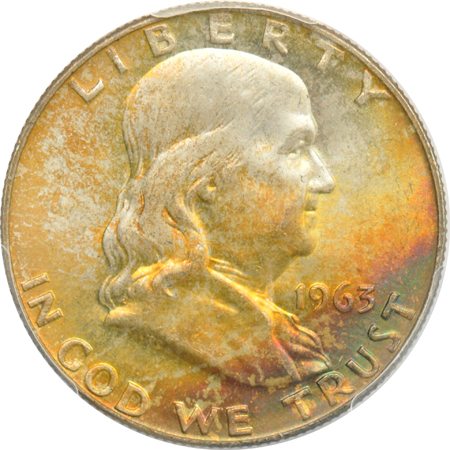 Description: Vida D. Bertie's Consignment. Jefferson nickels include: 1947-D (NGC MS-66 5FS "star", amazing Technicolor pattern that defies description) and 1950 (NGC MS-66 "star", veritable cornucopia of rainbow shimmers on both side that must be seen to be believed). Franklin half-dollars include: 1958-D (NGC MS-65 FBL "star", outrageous neon salmon-green, lavender-rose and ultraviolet layered on by a mint-set holder no doubt) and 1963-D (PCGS MS-65 FBL, blood-red, platinum-bronze and sea-green mint set toning patterns on both sides). Four coin lot.