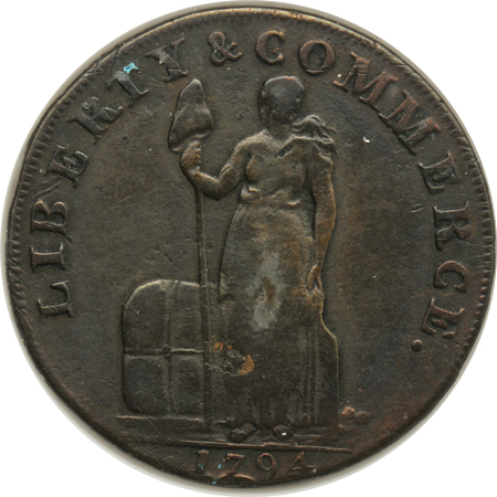 Description: The Talbot, Allum and Lee token was probably designed by Thomas Wyon and can bear the date of either 1794 or 1795, as is denoted by this Capital Plastics pairing. The tokens were denominated as "one cent" and weigh on average about the same as a contemporary regal British halfpenny. Presented here is a 1794 example that should grade Fine or so, struck on a decent planchet, while the 1795 should easily meet AU parameters, and even offers tantalizing hints of mint red. Two coin lot.