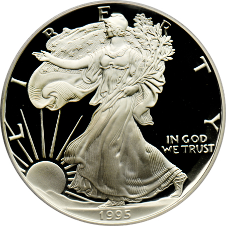 Description: 71 graded PF-70 DCAM at PCGS, and therefore tied for finest known. 1995-W is the key to the series and particularly scarce in the PCGS "perfect" grade. Although the surface stands up to even exceedingly close inspection, a couple of tiny crumbs adhere to the obverse.