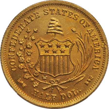 Description: Mintage: 5,000. The August C. Frank Company restruck these imitation Confederate half-dollars at the behest of Robert Bashlow, and they were produced in three different metals. The half-dollar restrikes are much rarer than the often-seen cents. The Confederate die for the reverse was mated to a specially engraved obverse die, and this particular example was struck in so-called "goldine" metal.