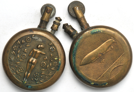 Description: Unusual for today's auction is this quartet of World War I "trench art" lighters. Motifs vary, with one showing a Zeppelin opposing a heavier-than-air flying machine, another showing the back of a nude female on both sides, and a third and fourth comprised of French 2-francs coins maneuvered for use as casement parts. Exceedingly cool items in this grouping from the Great World.